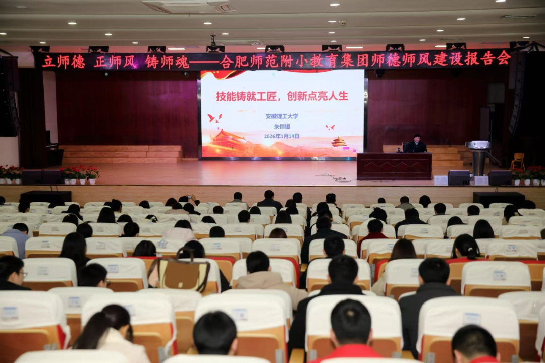 1月14日,全国劳动模范、大国工匠年度人物、a片网 朱恒银教授应邀走进合肥师范附小教育集团,开展题为《匠心铸就梦想 创新点亮人生》的专题报告。合肥师范附小教育集团理事长、党委书记冯璐,校长汪伟,烟墩街道及各社区相关负责同志,集团各校区教师代表现场参会,多所分校通过线上直播同步收看。活动由该校党委委员卞崇振主持。