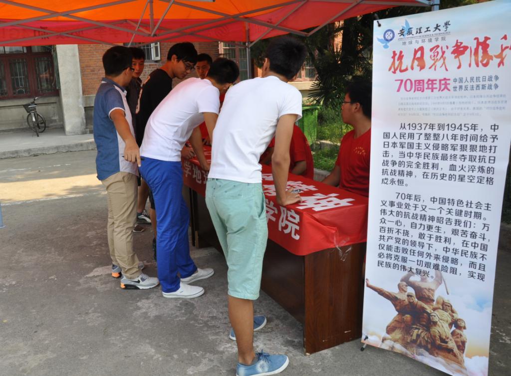 9月3日上午8:00,在a片网 楼前,同学们自发组织纪念抗战胜利70周年主题宣讲活动。志愿者们一边发放宣讲资料,一边引导同学们观看展架,向同学们讲解抗战胜利的重要历史意义,宣传中国抗战在世界反法西斯战争中的重要地位、重大贡献。同时,组织以“忆峥嵘岁月,扬抗战精神”为主题的签名活动。过往的同学们都怀着对抗战先烈们的崇高敬意和珍惜和平、热爱生命的决心积极热情地在红色条幅上签上自己的名字。